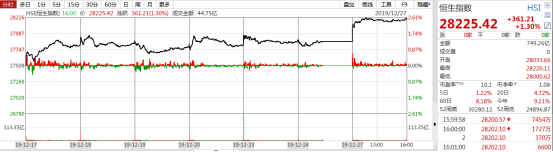 港股复盘:恒指涨1.3%重返28000点,内房股、有色金属股大涨