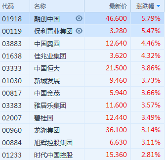 个股方面,碧桂园打仗3.49%领涨恒指;银河娱乐、中国石油、金沙中国、华润置地皆升超2%;腾讯亦大涨近2%;吉利汽车、中国移动、中国神华、瑞声、香港交易所等蓝筹纷纷上涨;舜宇、信和置业等少数权重下跌;安踏体育大跌4.59%为最差国指;内房股融创中国大涨近6%;港股通标的股洛阳玻璃飙升20%,紫金矿业大涨逾12%。