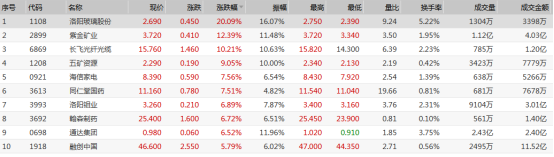 从港股通个股涨跌幅表现看,今日港股通标的中涨幅前五的个股分别是:洛阳玻璃股份(1108.HK)、紫金矿业(2899.HK)、长飞光纤光缆(6869.HK)、五矿资源(1208.HK)、海信家电(0921.HK)。