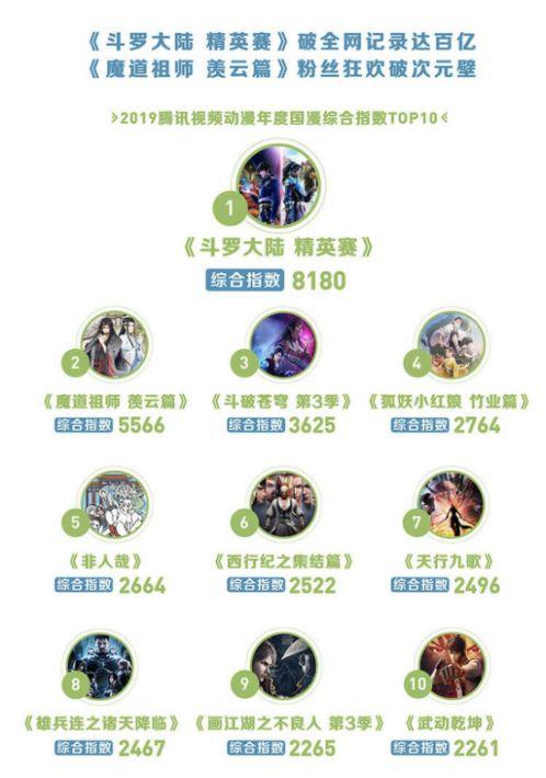 报告显示,2019年腾讯视频动漫年度国漫综合指数前三名分别为《斗罗大陆精英赛》《魔道祖师羡云篇》《斗破苍穹 第3季》,而这三部均为网文IP衍生内容。
