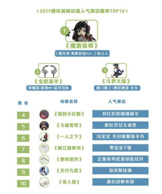 另外,腾讯视频的动漫IP衍生产业链也已经形成,例如《魔道祖师》中角色魏无羡的粘土人、《全职高手》和荣耀、酷狗一起发售的联名版蓝牙耳机、《斗罗大陆》的手办都是今年最受欢迎的动漫人气周边。