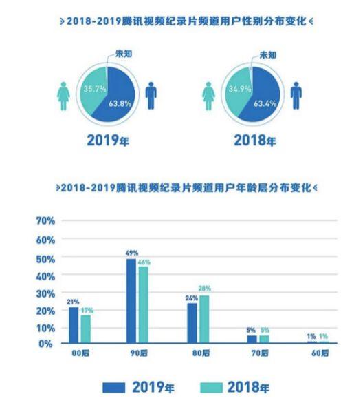 在纪录片方面,观看用户群体呈现偏年轻化趋势。据报告数据显示,90后观看纪录片占比近半,男性用户居多占比达63.8%,00后用户增长最多,从2018年的17%上涨至2019年的21%。用户中本科学历占比达到50.1%,对世界充满好奇心的大学生是观看纪录片主力军。