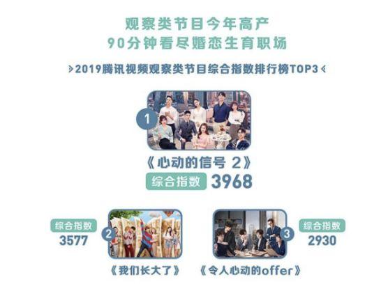 第二,从节目题材看,今年观察类节目高产,《心动的信号2》《我们长大了》《令人心动的offer》为观察类节目综合指数排行榜TOP3。