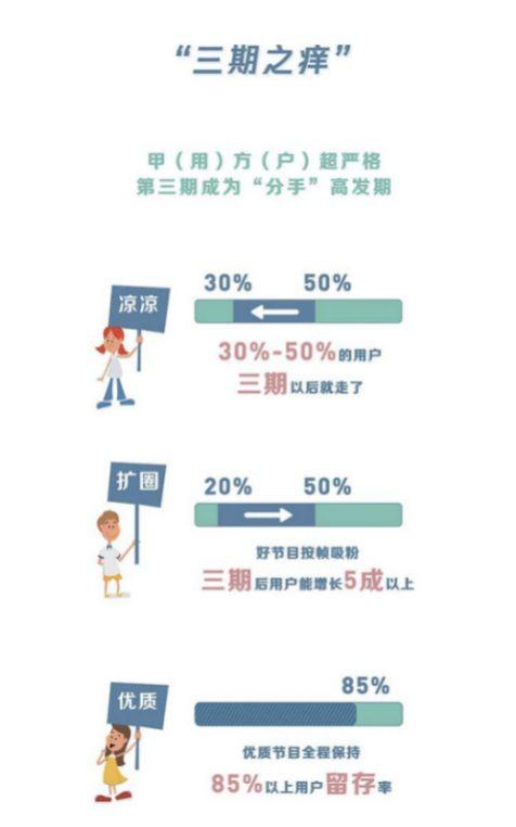 “三期之痒”指综艺节目在播出三期后是一个明显的拐点。对于低品质节目,有30%-50%的用户会在看过3期后流失;好节目按帧吸粉,3期后用户能增长五成以上;优质节目则是全程保持85%以上用户留存率。