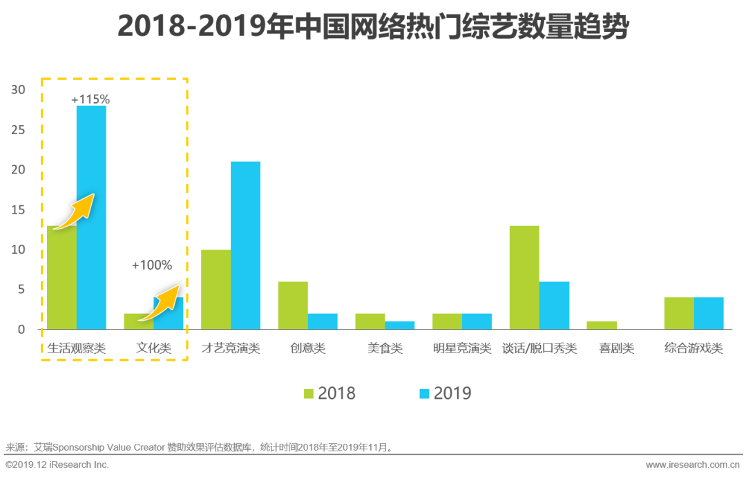 根据艾瑞SVC监测结果显示,截至2019年11月的所有网络头部综艺中,文化类与生活观察类节目的数量同比增长明显,增长率分别为115%和100%,这个趋势在2019年的最后一个月仍在延续。