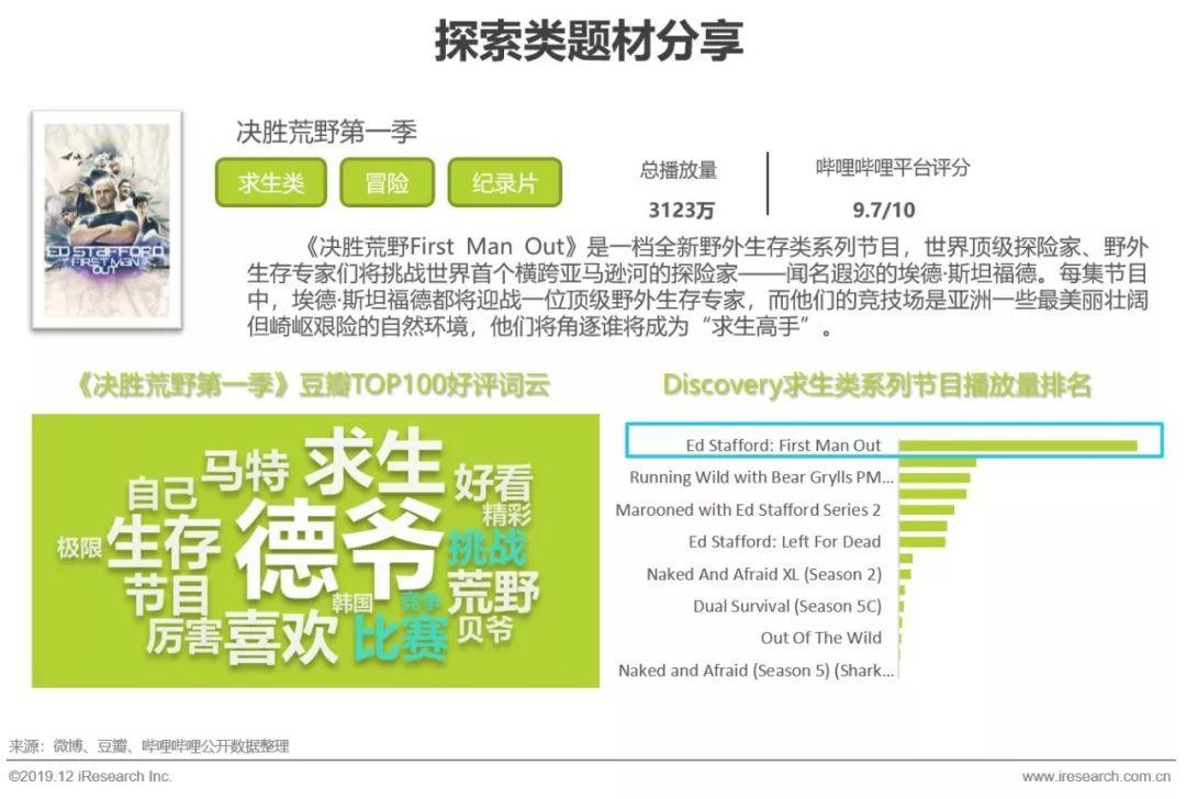 例如由B站从Discovery引进的探索类节目《决胜荒野First Man Out》,在荒野求生的题材基础上新设专家比拼模式,为原本的单人挑战线新增竞争与冲突意味,提高求生类节目对观众的吸引力。在B站平台的播放量占总纪录片频道的13.85%,在目前Discovery所有求生类系列中暂居第一位。