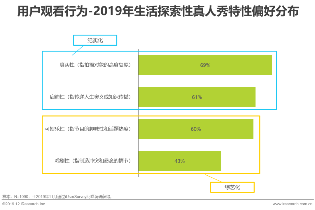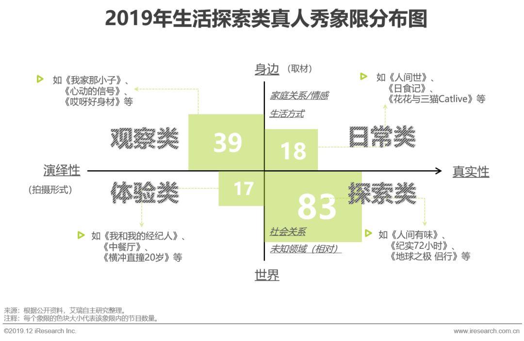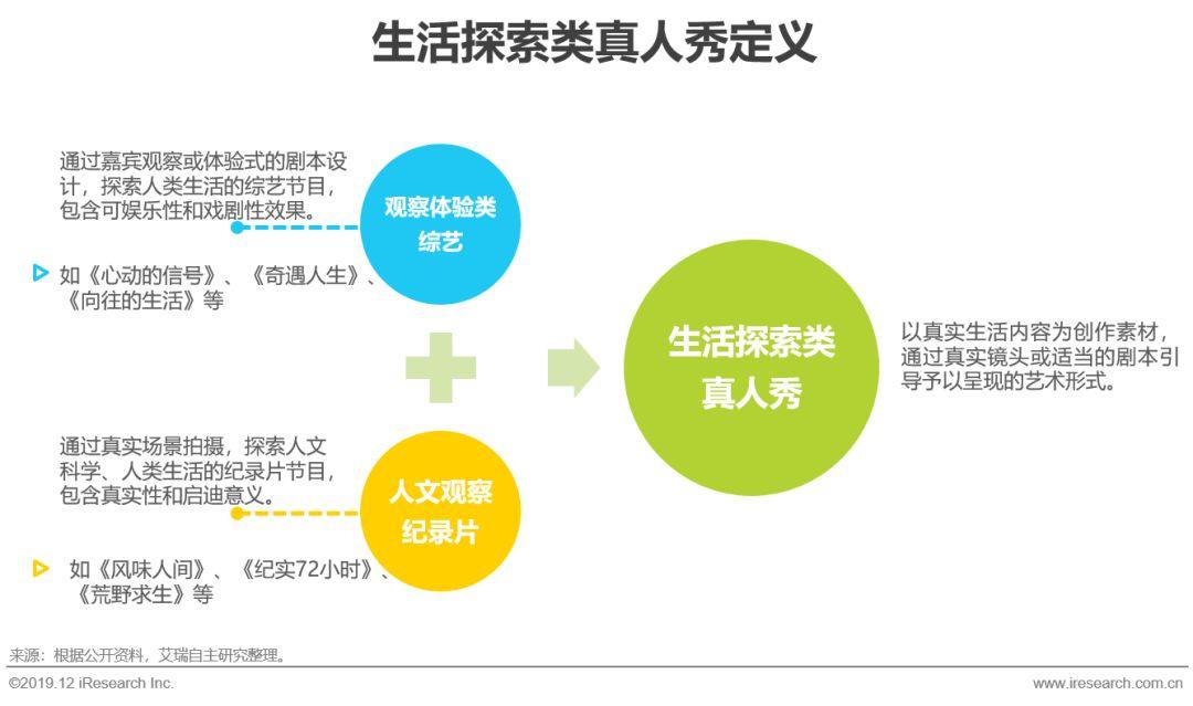 艾瑞联合全球领先的纪实和娱乐公司Discovery共同就综艺与纪录片的融合趋势进行深入研究,将此类新兴形式的节目定义为“生活探索类”节目,即以真实生活内容为创作素材,通过真实镜头或适当的剧本引导予以呈现的艺术形式。