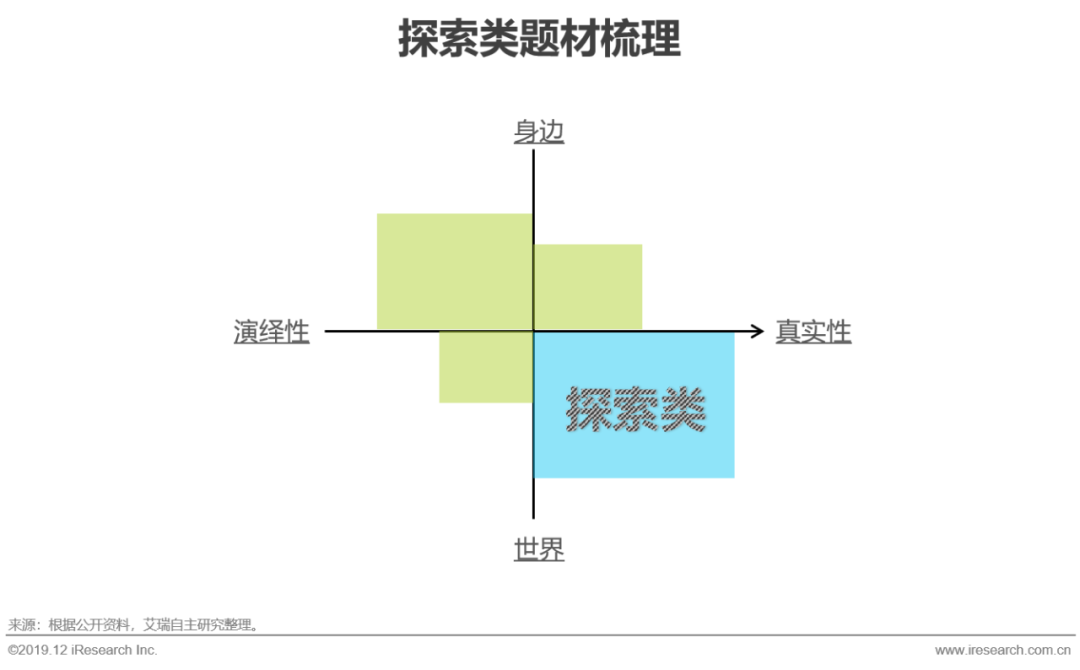 为了深一层研究生活探索类节目的内容趋势,我们又以节目风格(演绎性或真实性)、节目取材(身边或世界)为纵轴划分出了四个象限,顺时针依次为“日常型”(身边+真实性),“探索类”(世界+真实性),“体验类”世界+演绎性)和“观察类”(身边+演绎性)。