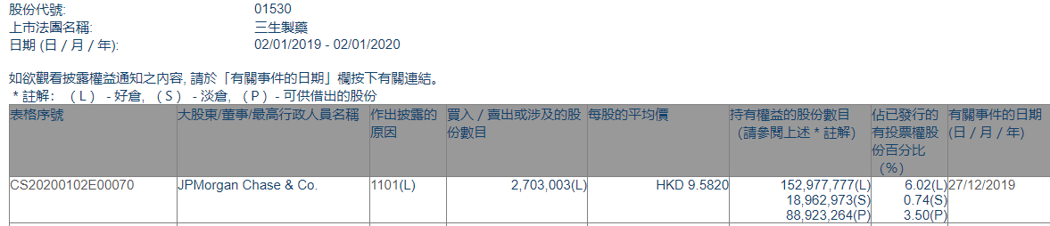 格隆汇获悉,根据港交所最新权益披露资料显示,2019年12月27日,三生制药(01530.HK)获JP Morgan Chase & Co.每股均价 9.5820港元,增持270.3万股,总价约2590万港元。