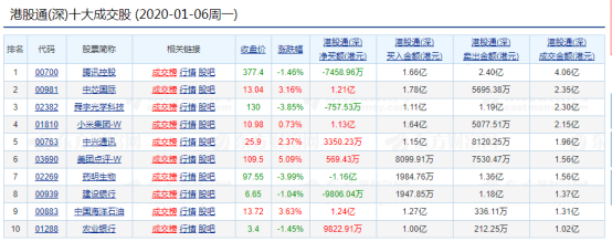 今日港股通(深)前十大成交个股是腾讯控股、中芯国际、舜宇光学科技、小米集团、中兴通讯、美团点评、药明生物、建设银行、中国海洋石油、农业银行其中净流入最多的个股是中国海洋石油,净流入1.24亿港元;净流出最多的个股是药明生物,净流出1.16亿港元。