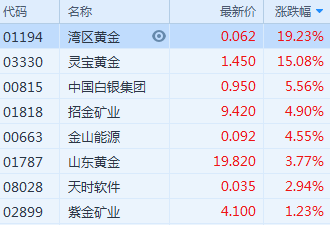 今日,受避险情绪升温的影响,黄金股显出上扬之势,湾区黄金(1194.HK)领涨板块,涨幅19.23%,中国白银集团0815.HK)、招金矿业1818.HK)、山东黄金1787.HK)、灵宝黄金(3330.HK)等纷纷跟涨。值得注意的是,基于对宏观市场环境的不确定性加剧,避险需求不断增强,今年迄今,三个交易日不到,国际现货黄金价格上涨近4%,但A股黄金指数已上涨超过10%。