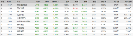 跌幅前五的个股分别是:联合能源集团(0467.HK)、五矿资源(1208.HK)、丘钛科技(1478.HK)、先健科技(1302.HK)、中国天然气(0931.HK)。