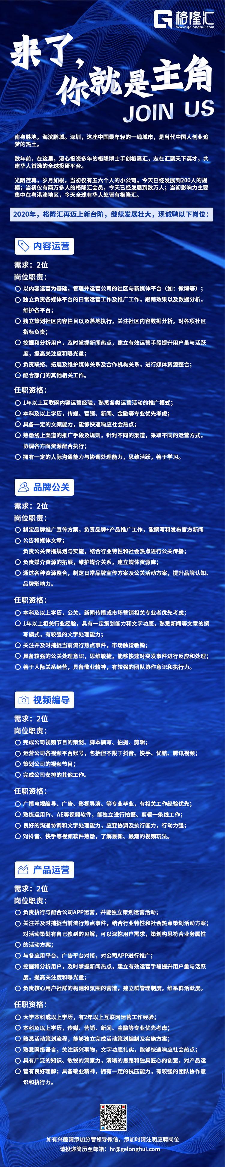 2020年,格隆汇再迈上新台阶,继续发展壮大,现诚聘以下岗位: