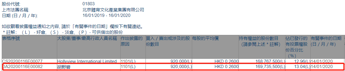 【增減持】北京體育文化(01803.HK)獲胡野碧增持92萬股