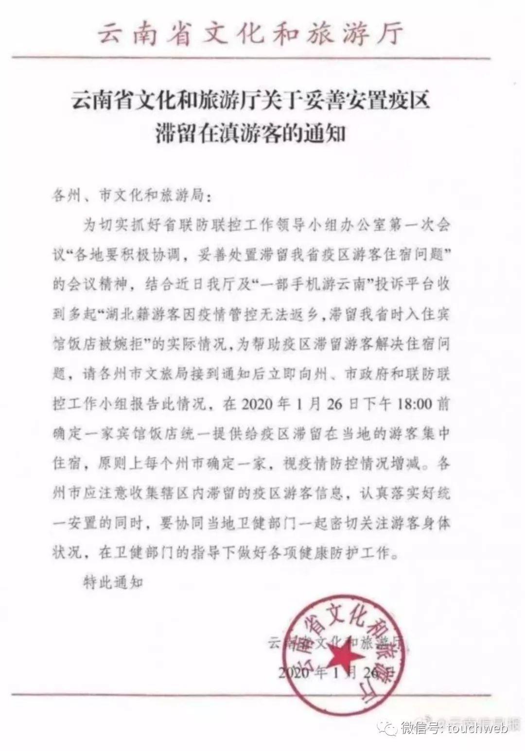 好在也有云南这样的省伸出了援手。云南省文化和旅游厅日前发布关于妥善安置疫区滞留在滇游客的通知,要求云南省各州市应注意收集辖区内滞留的疫区游客信息,并在2020年1月26日确定一家宾馆饭店统一提供给疫区滞留在当地的游客集中住宿,原则上每个州市确定一家,视疫情防控情况增减。