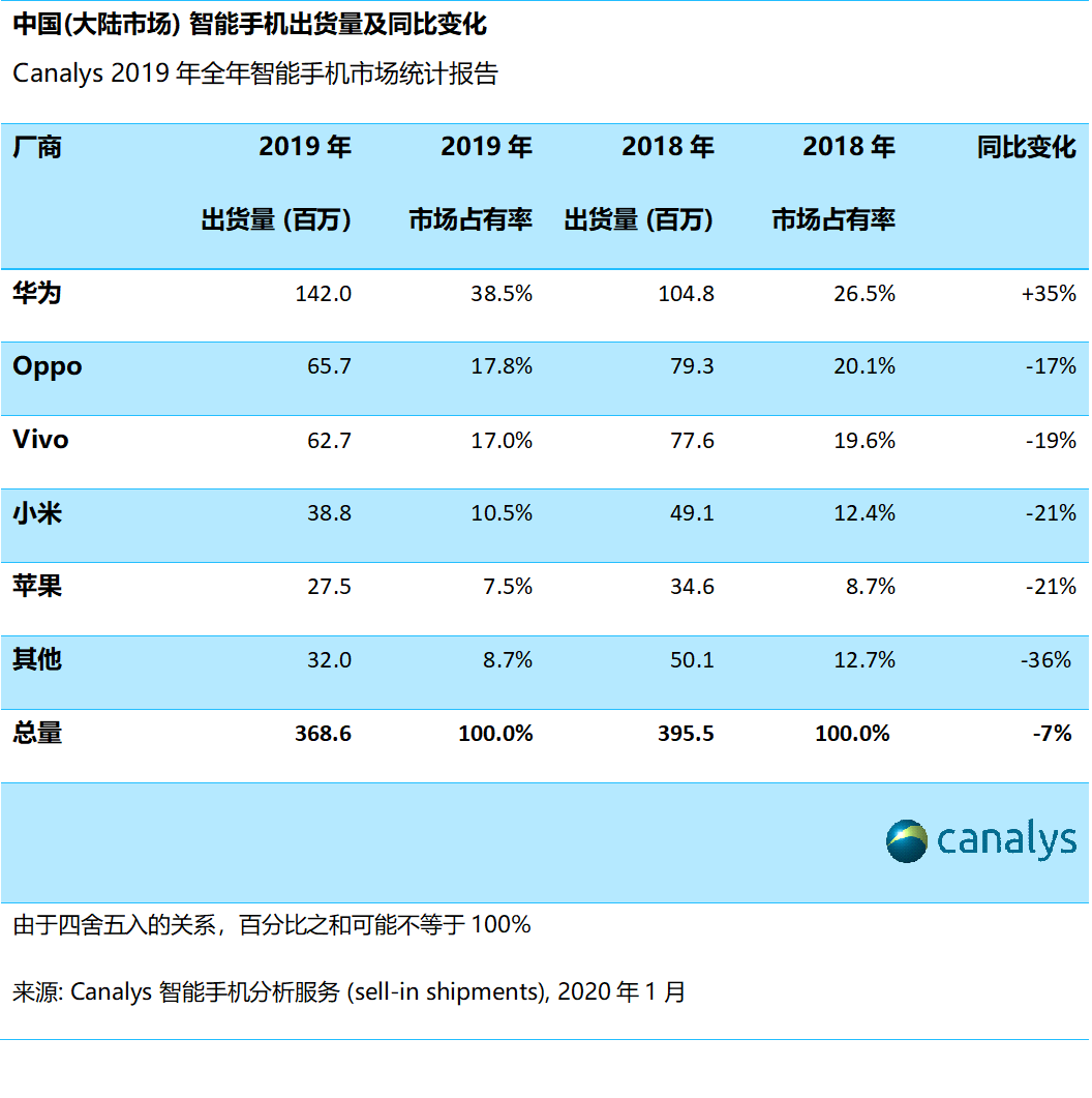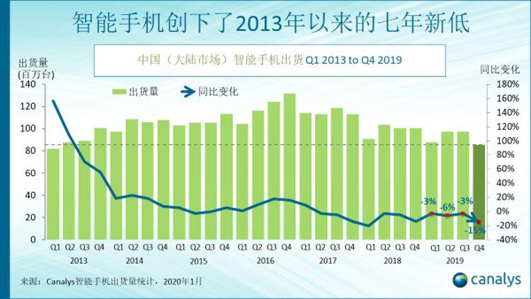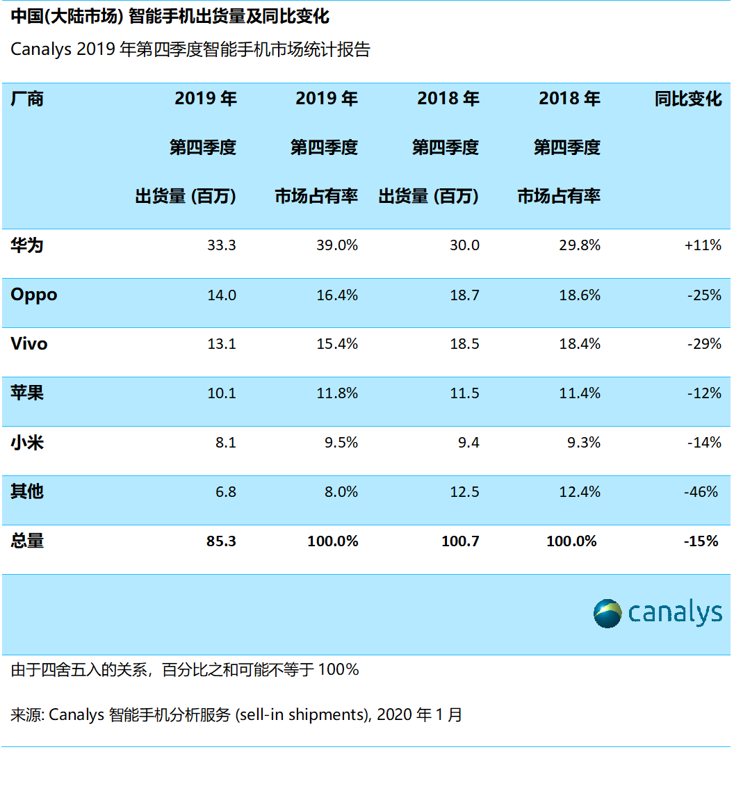 据全球科技行业权威调研机构Canaly最新数据,中国(大陆市场)智能手机市场在2019年第四季度出货量下降15%,至8530万部,这是连续第11个季度下跌,创下了2013年第一季度以来的七年新低。2019年全年,国内市场出货量3.69亿台,同比下降7%。在第四季度的智能手机传统销售旺季,2019年第四季度市场表现明显反常。4G手机市场饱和导致的销售大幅放缓,加上主要厂商的5G手机需求不如预期的旺盛。与此同时,在2020年5G大幅推广前,渠道开始消化4G库存。华为保持了在中国的领先地位,市场份额达39%,出货同比增长了11%。但是环比出现了两成的下降。Oppo和Vivo仍然排在第二和第三位,出货量分别同比下降25%和29%。苹果排名上升一位,排名第四,小米排名第五。
