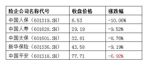 然而值得注意的是,在A股5大险企当中,中国平安(601318.SH)的跌幅相对较轻(-6.92%),表现得抗跌;而中国人保跌停,中国人寿盘中跌停,尾盘稍有松动;中国太保和新华保险的跌幅都在9%附近。