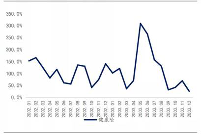 数据显示,“非典”期间健康险保费规模大幅增加,2003年5-7月,健康险单月保费同比增速分为别309.3%、265.3%和157.7%,为前后年份的高点。