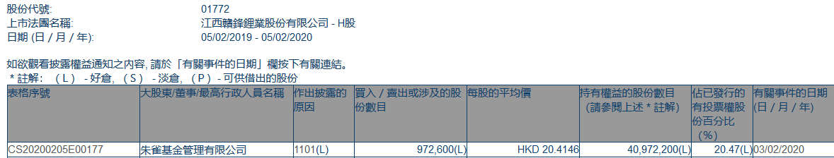 格隆汇获悉,根据港交所最新权益披露资料显示,2020年2月3日,赣锋锂业(01772.HK)获朱雀基金管理有限公司每股均价20.4146 港元,增持97.26万股,总价约1985.5万港元。