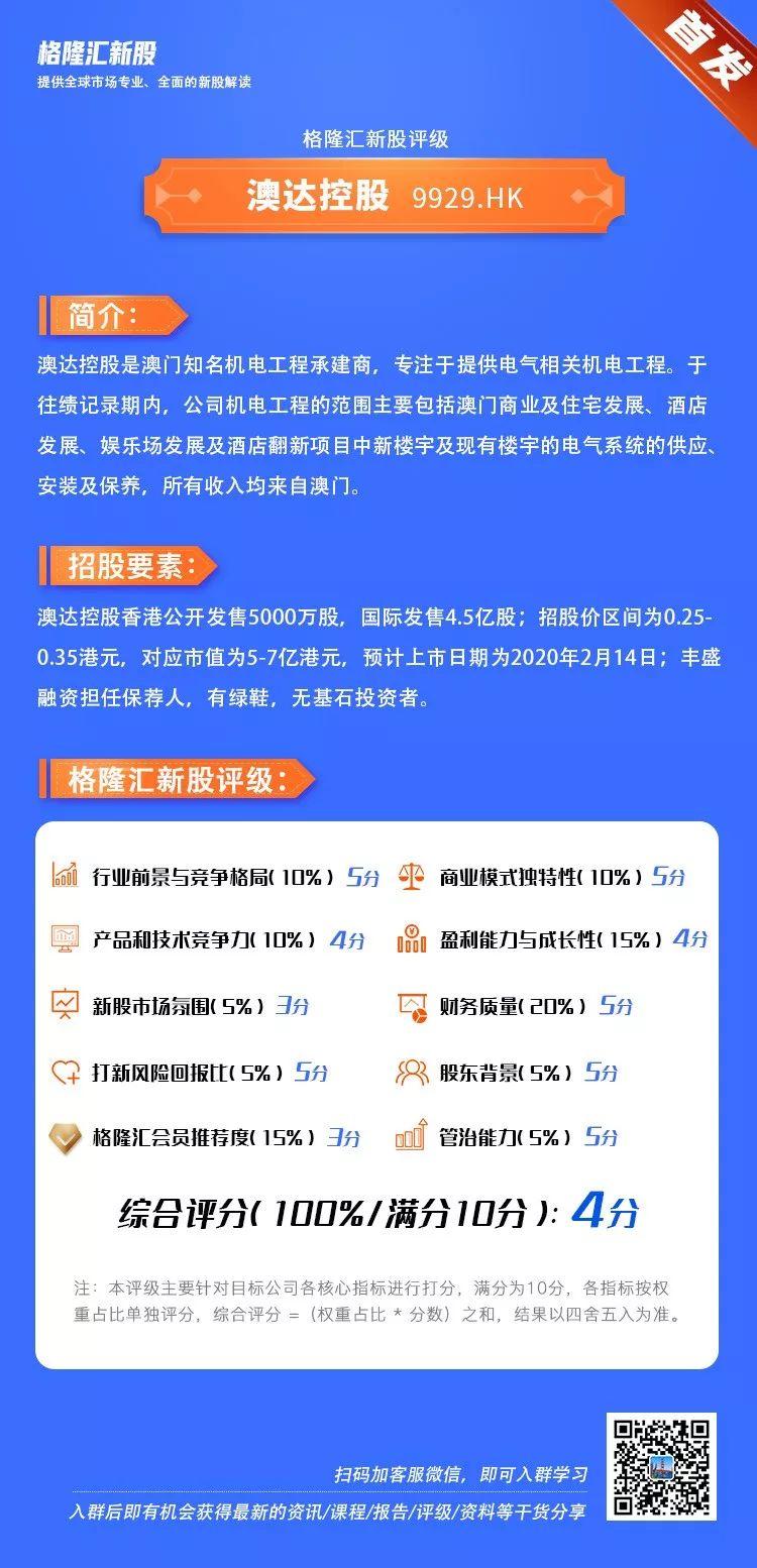 格隆匯新股研究根據已公開數據及獨家的內部評級體系,給予澳達控股的新股綜合評估分數為4,滿分為10分),如下圖:
