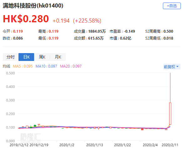 格隆汇2月11日丨满地科技股份(1400.HK)盘初一度暴涨至480%,现涨幅收窄至225.58%,报0.28港元,暂成交615万港元,最新总市值0.62亿港元。