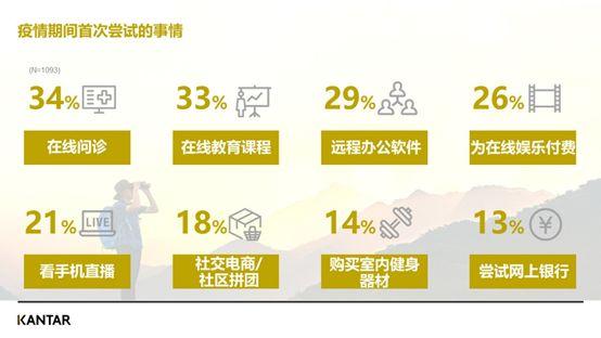 非常值得注意的是,本次疫情推动了很多消费者第一次尝试新事物,为很多新兴行业的渗透率提升提供了机遇。在所有受访者中,有84%的人都表示至少尝试了一种新的服务,其中提及最高的是网上问诊(34%)和在线教育(33%),其次是远程办公(29%)和第一次为数字娱乐服务付费(26%)。