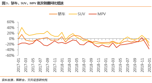 轿车、SUV、MPV销量降幅均达到两位数。根据乘联会数据,1月轿车、SUV、MPV批发销量分别为74.2万辆、76.7万辆和8.0万辆,轿车批发销量同比下降25.9%,SUV批发同比下降14.1%,MPV同比下降37.2%。