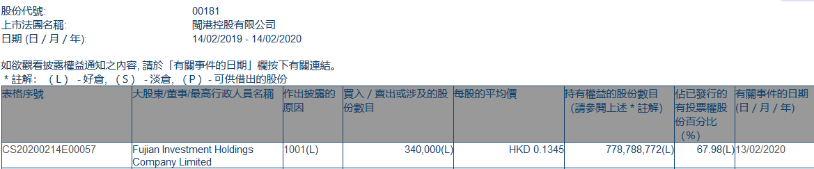 閩港控股(00181.HK)獲Fujian Investment Holdings增持34萬股