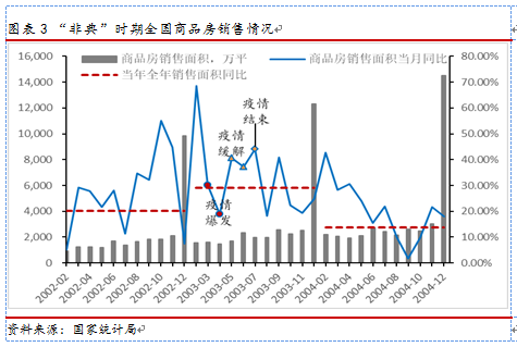 “非典”疫情并未对2003年的房地产市场的增长趋势,主要原因有4方面:一是,1998年房改后我国房地产市场处于快速发展期,2003年8月明确房地产产业为支柱产业;二是2002年我国加入WTO后经济处于高速发展阶段,2003年GDP增速高达10%;三是2003年货币政策从宽松到适度从紧;四是20世纪初,商品房的销售旺季为12月(12月销量约占全年38%),疫情爆发期的月销量约占全年5%,是商品房的销售淡季。