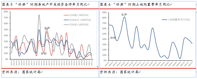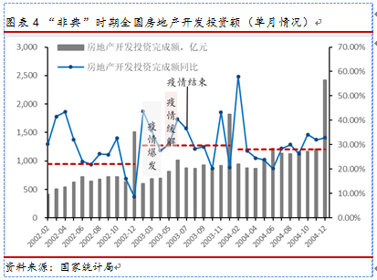 “非典”时期处于地产投资“旺季”,疫情使地产投资延后,全年的投资增长趋势并未改变。地产投资主要受销售预期的影响,2003年房地产市场处于快速发展时期,疫情期间地产开工、施工和竣工工程都受到一定影响,地产投资增速短期放缓;但随着疫情缓解地产各项投资均恢复。如图表4所示,2003年地产一季度投资旺季遇到“非典“疫情,4月投资增速下滑,但疫情缓解后,投资迅速反弹,填补一季度的投资缺口。