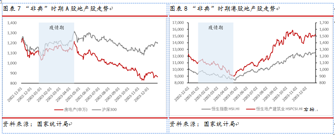 同样受到“非典”疫情影响的大陆和香港两地的地产股走出背离行情,A股地产股在疫情期上涨,疫情结束后下跌,港股地产股在疫情期下跌,疫情结束后补涨。疫情下两地地产股的背离走势说明,地产股长期走势与疫情相关性较弱,更多受大盘走势、资金流动性以及政策等多多方面的影响。疫情形成的短期恐慌情绪造成股价下跌,后期因基本面企稳股价又呈现回升态势。