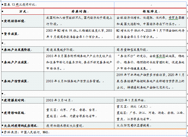 两次疫情的行业政策异同:2003年房地产产业被确立为支柱产业,政策态度是积极的;2020年房住不炒、因城施策,房地产监管态度是“托而不举,压而不破”。信贷方面,2003年下半年加强房地产业的信托监管,2020年也是严防信贷资金违规流入房地产市场。