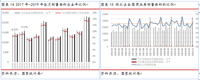 湖北省是新冠肺炎的重灾区,确诊病例超过2万人,全国约2/3的确诊病例都在武汉。湖北省商品房销售面积约占全国商品销售面积5%左右,如图表15所示。受疫情影响湖北省一季度商品房销售会有一定程度下滑,随着疫情缓解预计后期销售会有所反弹。