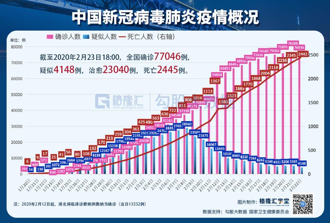 截至2月23日18点,全国31省市累计报告确诊新型肺炎病例77046例,疑似病例减至4148例,死亡2445例,治愈23040例。