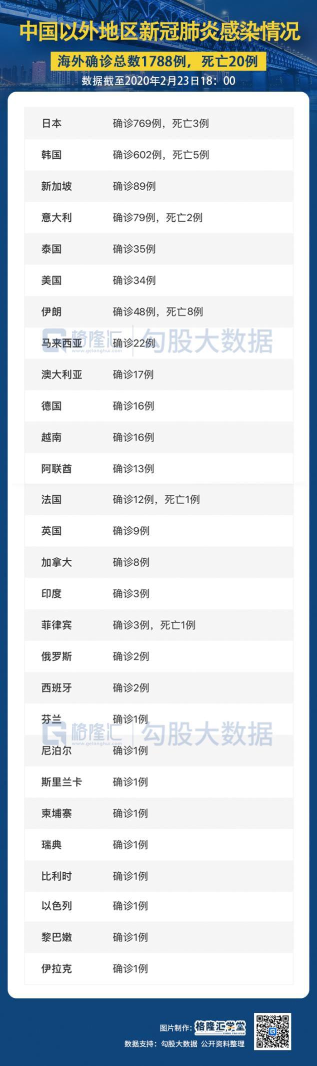 截至目前,海外已累计确诊新冠肺炎病例1788例,死亡20例。其中,日本、韩国确诊最多;伊朗死亡8人,为海外死亡人数最多的国家。