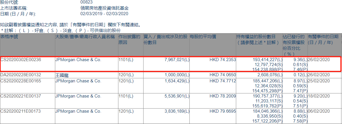 格隆匯獲悉,根據港交所最新權益披露資料顯示,2020年2月26日,領展房產基金(00823.HK)獲JP Morgan Chase & Co.每股均價74.2353港元,增持796.70萬股,總價約5.91億港元。