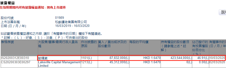 格隆汇APP获悉,根据联交所最新权益披露资料显示,2020年3月10日,松龄护老集团(01989.HK)获实控人邓耀升在场外以每股均价1.6470港元增持8783.2万股,涉资约1.45亿港元。增持后,邓耀升最新持股数目约为4.2354亿股,持股比例由37.18%升至46.91%。