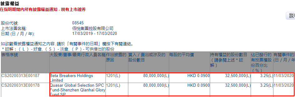 格隆汇APP获悉,根据联交所最新权益披露资料显示,2020年3月11日,佰悦集团(08545.HK)遭Quasar Global Selection SPC Fund-Shenzhen Qianhai Glory Fund SP在场内以每股均价0.09港元减持8000万股,涉资720万港元。减持后,该基金最新持股数目为3250万股,持股比例由11.25%降至3.25%。