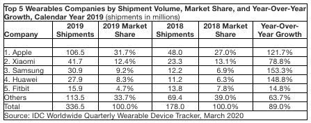 按照IDC统计, 2019年全年可穿戴设备出货量达到3.365亿部,苹果、小米、三星出货量位居前三。苹果市占率为31.7%,远高于第二位的小米(41.7%)及三星(9.2%),且其出货量年增长率为121.7%。