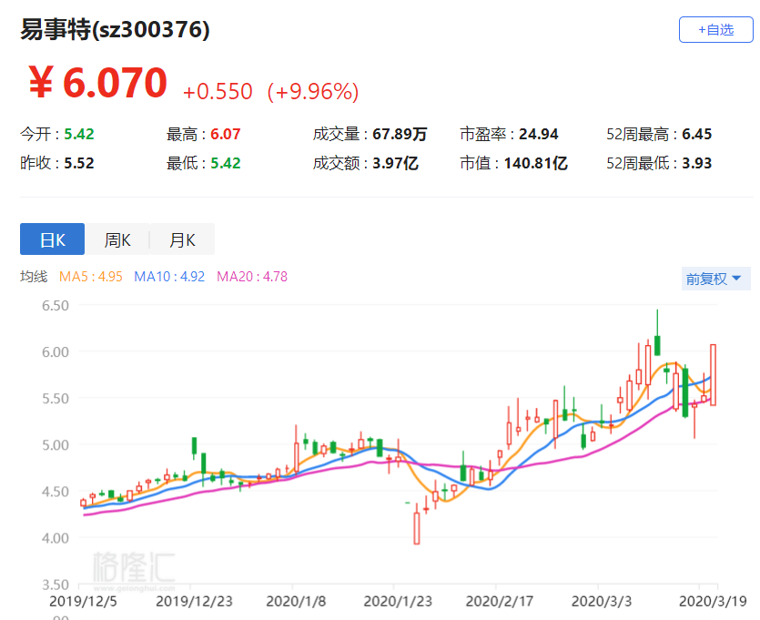 格隆汇3月19日丨易事特(300376.SZ)涨停,报6.07元,总市值141亿元。