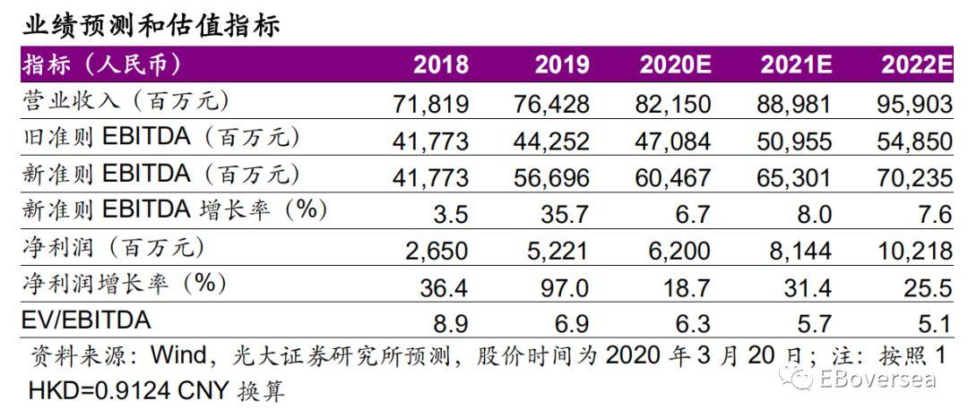 基于塔类业务表现不及预期,下调20-21年旧会计准则下EBITDA利润1.6%/5.5%至471/510亿元,新增22年预测为548亿元;预计新会计准则下20-22年EBITDA分别为605/653/702亿元,对应19-22E CAGR约7.4%。铁塔类资产估值的核心影响因素包括当地资本市场利率和铁塔股息率对比、EBITDA成长性。我们预计中国铁塔成长性维持稳定,未来估值抬升机会将来自股息率加大,考虑到19年分红比例扩大、稳定分红机制逐步兑现,维持“买入”评级,基于DCF估值法,维持目标价2.2港币(对应20/21年7.7/7.0倍EV/EBITDA)。