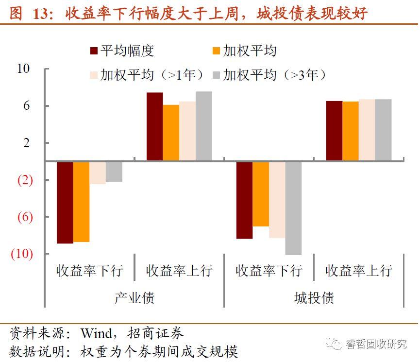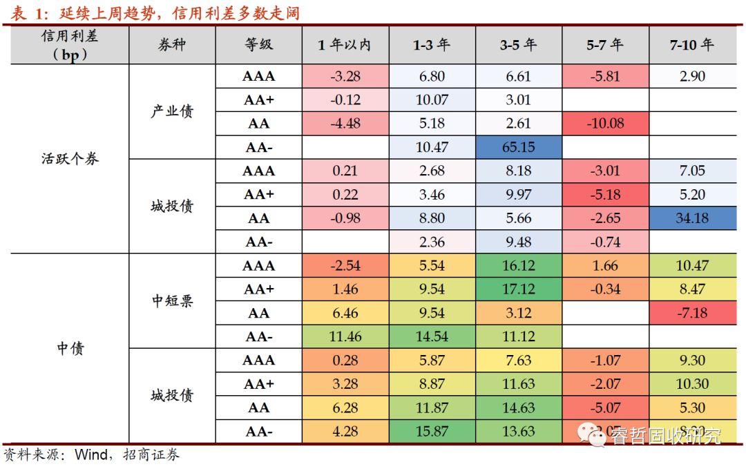首先,活跃个券走势分化,1)1年期以内产业债收益率下行为主,收益率上行品种则向中长端个券集中,2)城投债收益率上行及下行样本相当,但剔除1年期以内个券后,期限偏长的城投品种收益率多数上行。由于1年期以内个券收益率变动与资金利率相关性较强,此前相对涨幅偏低的产业债,本周进一步补涨。