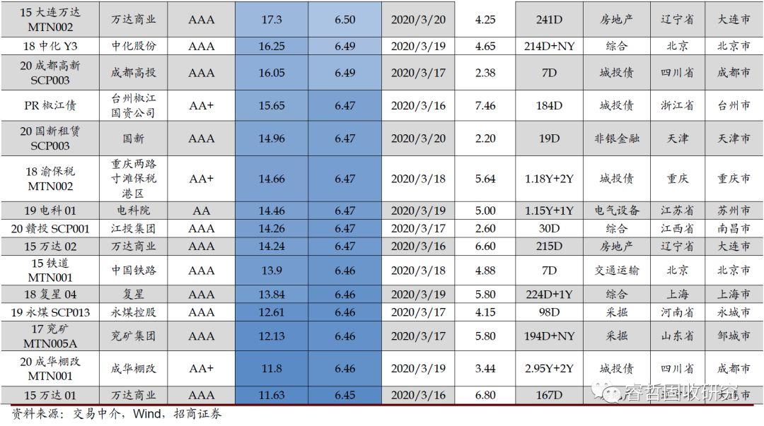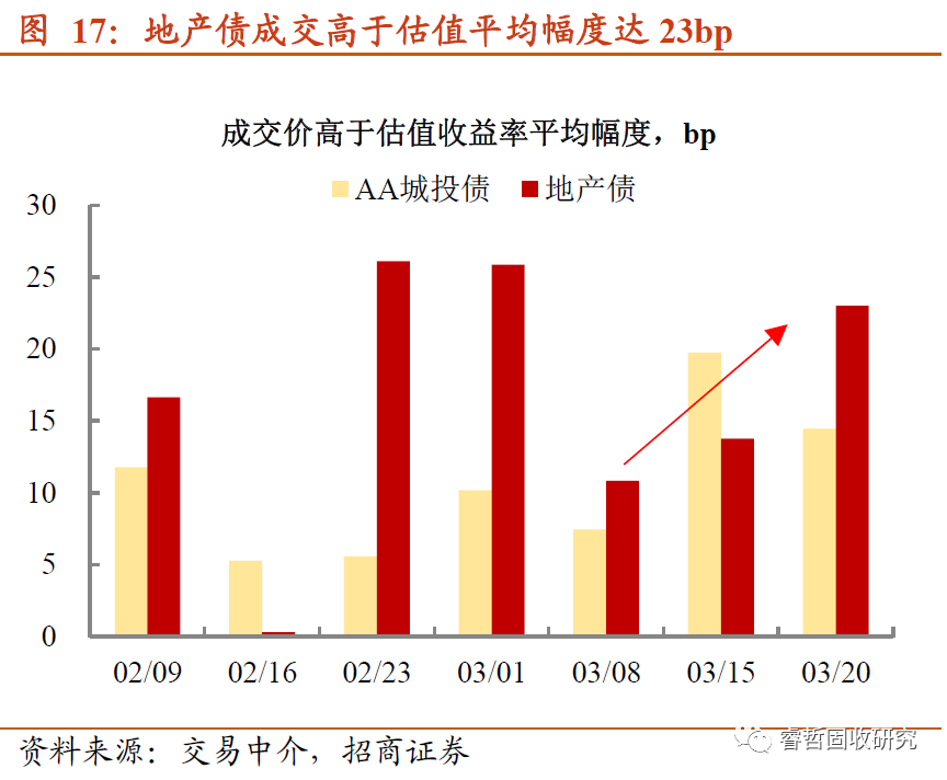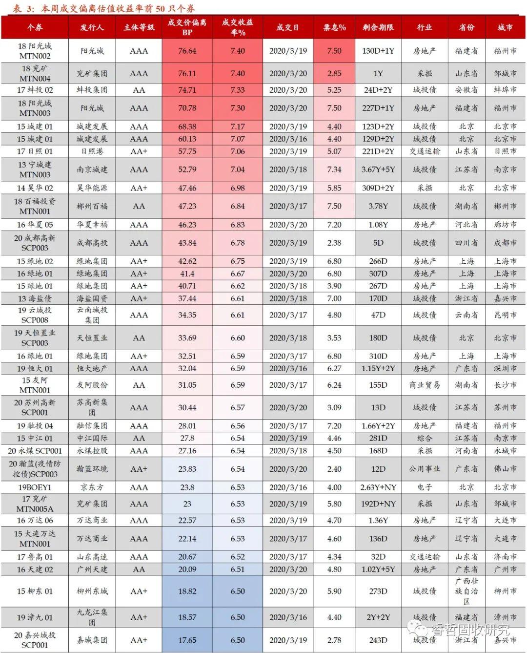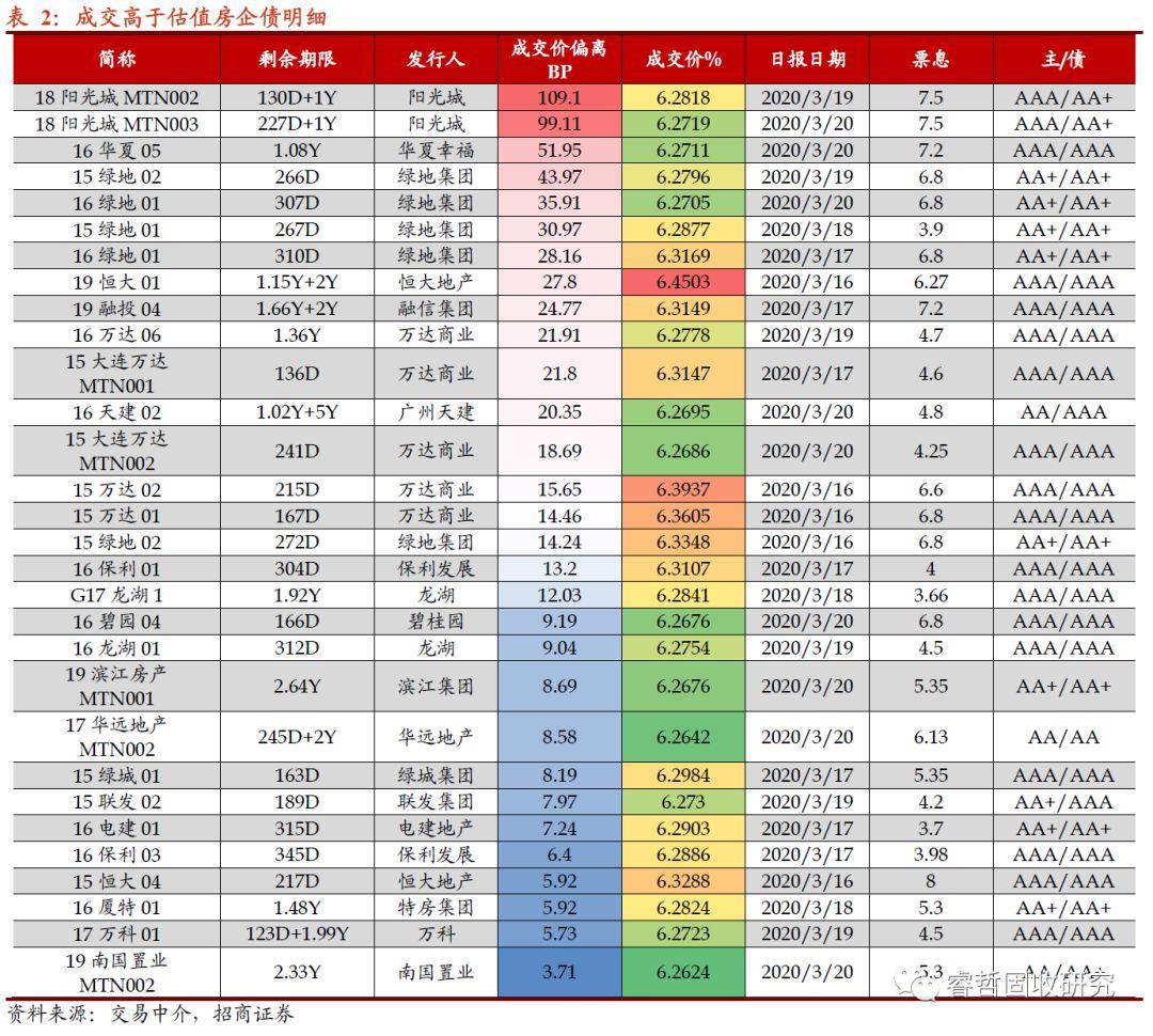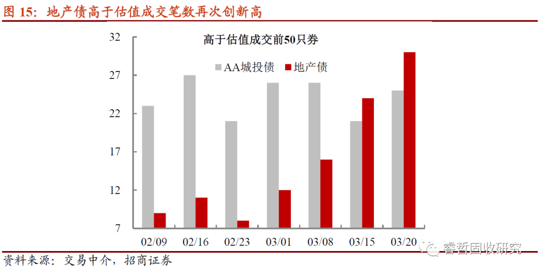 哪些个券多是成交高于估值?房企债演绎境内外的“天壤之别”。海外资本市场“流动性危机”的爆发引起强力去杠杆,各类资产价格出现暴跌,中资地产美元债同样难以幸免。然而,境内房企债交投并不逊色。本周房企债成交活跃度继续攀升,总成交笔数继续创新高(达到30笔),改善幅度明显好于AA城投债。不过,房企债流动性好转,买盘却“小心翼翼”,留有一定的“后路”,一是房企债成交期限不断缩短,二是要求卖盘给予的折价正在提升。