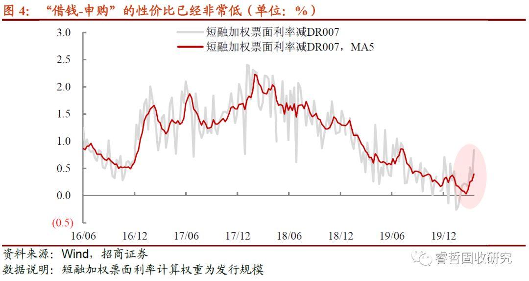 有趣的是,本周资金利率创新低(周五银行间隔夜质押回购利率降至0.86%,距离2009年最低点已经不足10bp的空间),按理说能够再次激发机构抢券。因为信用债“打新”一般遵循“质押→借钱→申购→二级卖出或者持有至到期”,资金越便宜,套利的空间越大。