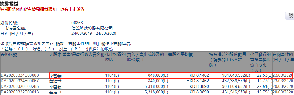 格隆汇APP获悉,根据联交所最新权益披露资料显示,2020年3月23日,信义玻璃(00868.HK)获执行董事兼董事会主席李贤义在场内以每股均价8.1462港元增持84万股,涉资约684.28万港元。增持后,李贤义最新持股数目约为9.0465亿股,持股比例由22.51%升至22.53%。