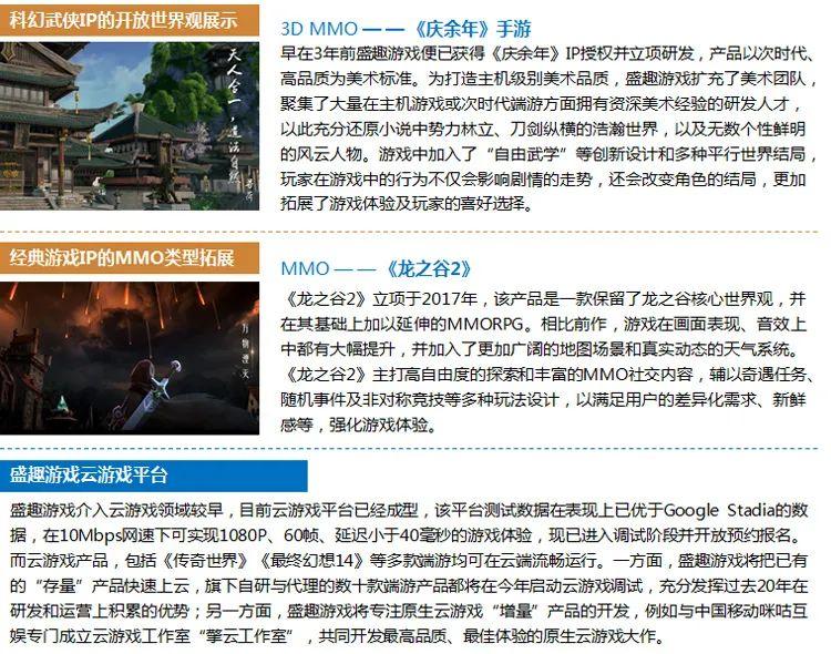 目前游戏市场中MMO品类的玩法已经十分成熟,但用户需求仍在不断增长变化,游戏市场更需要具有差异化内容的创新产品来满足日益多元的游戏用户需求。在此背景下,盛趣游戏选择继续巩固自身MMO领域的研发优势,并依托多款端改手产品的经验,更加聚焦在不同领域的IP特色,针对这些IP所面向的差异化用户,去定制更为多元的玩法,从研发的角度更好地去诠释IP。除MMO品类外, 盛趣游戏也在不断向二次元、云游戏等多细分领域开辟新赛道,通过研发成本的投入,争取在细分领域的早期发展阶段建立竞争优势。