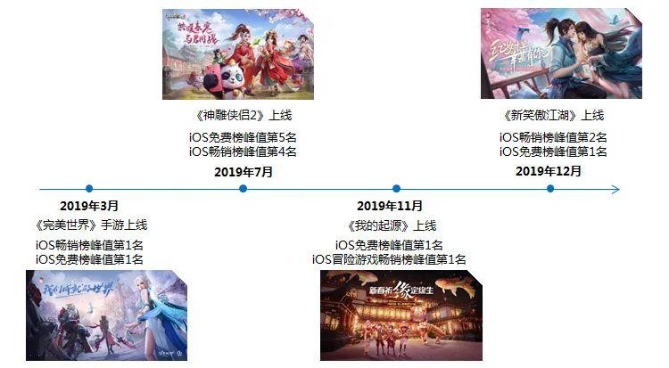 MMO类产品大多需要较长研发周期,对研发团队的综合实力要求较高,而完美世界游戏在2019年共上线了4款MMO类游戏产品,并且无一例外地冲入过iOS畅销榜TOP10,足见其在MMO类玩法领域的积累与爆发力。其中《完美世界》手游、《新笑傲江湖》表现更显强势且稳定,《完美世界》手游上线至今近1年时间内,始终保持在iOS畅销榜前列;而《新笑傲江湖》则为继《完美世界》手游之后又一表现强劲的MMORPG产品,上线2个月以来排名稳定在iOS畅销榜TOP20以内。在良性的市场与用户数据反馈下,其未来有望进一步获得产品升级,获得更强的市场竞争力。