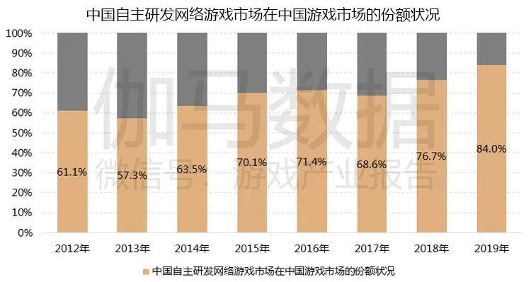 近年来,中国自主研发的游戏已经占据了国内市场的绝对主流,而且还在连年增长。伽马数据统计显示,2019年这个比例达到了惊人的84%。
