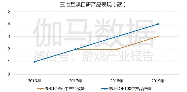 三七互娱的自研收入、研发投入产出比等多项评分居高。通过观察三七互娱财报信息和伽马数据监测数据可以发现,随着三七互娱研发投入的在不断增加,其自研产品收入、进入伽马数据流水榜TOP100的产品数量也都随之增加,2019年自研收入增长明显。这一方面受到发行力度的影响,2019年三七互娱的营销力度有所加强,为产品提供了流量保证;另一方面,这也代表着三七互娱产品质量的升级,无论流量向用户的转化,还是用户付费水平的提升均离不开产品质量的把控。