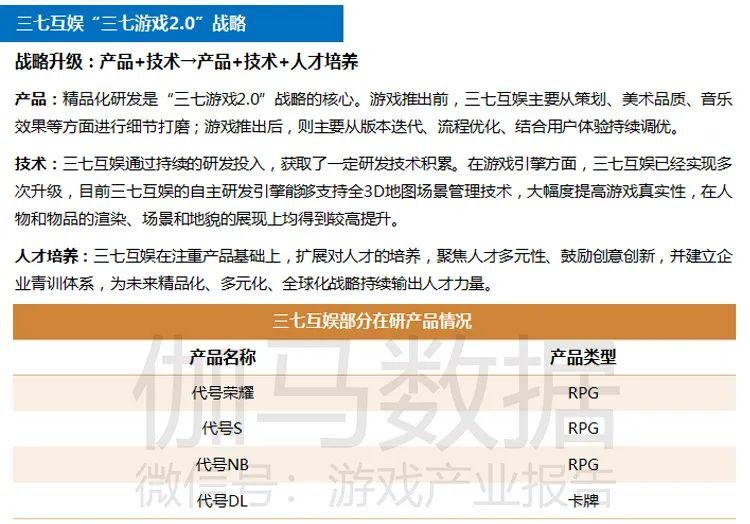 三七互娱首款自主研发产品发布于2014年,其自研产品能够短时间形成市场竞争力与其研发战略的制定密切相关。三七互娱围绕市场与用户需求制定研发战略,并根据需求变化不断调整研发战略。2019年,国内发展较快的移动游戏市场趋于成熟,市场对精品产品、创新产品的需求不断提升,三七互娱也因此实施研发战略升级,旨在积累更多研发人才,鼓励创意创新,发展多元化产品。2019年,从三七互娱的在研产品来看,其自研产品类型更加丰富,多品类的研发经验积累也将加速三七互娱研发实力的提升,未来市场表现可期。